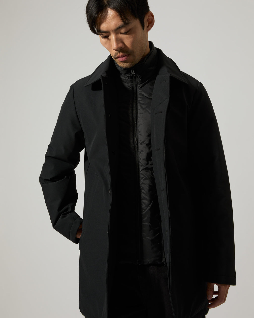 Crafted in a 4-way stretch recycled nylon quality certified by the Global Recycle Standard, this car coat inspired style is both waterproof and insulated. Tailored outer jacket with a concealed sewn button front closure, featured with a detachable false inner jacket placed inside at front for added protection. Regular collar, welt pockets and fully lined. The applied membrane and taped seams makes this coat waterproof.