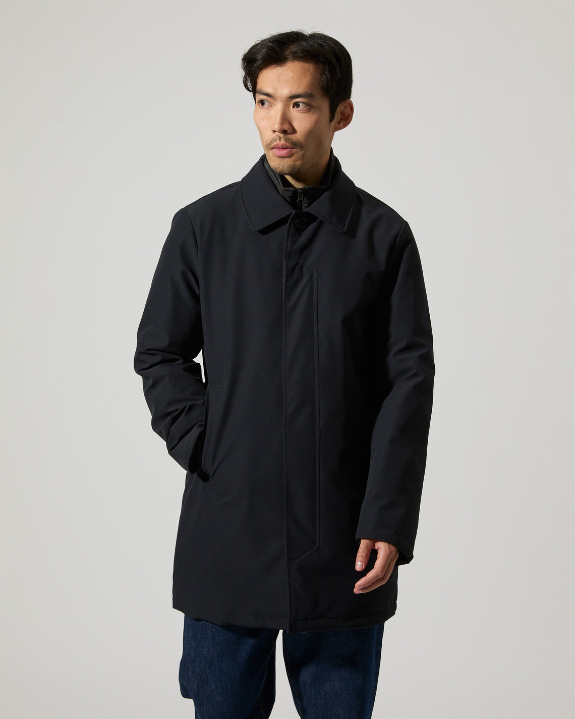Crafted in a 4-way stretch recycled nylon quality certified by the Global Recycle Standard, this car coat inspired style is both waterproof and insulated. Tailored outer jacket with a concealed sewn button front closure, featured with a detachable false inner jacket placed inside at front for added protection. Regular collar, welt pockets and fully lined. The applied membrane and taped seams makes this coat waterproof.