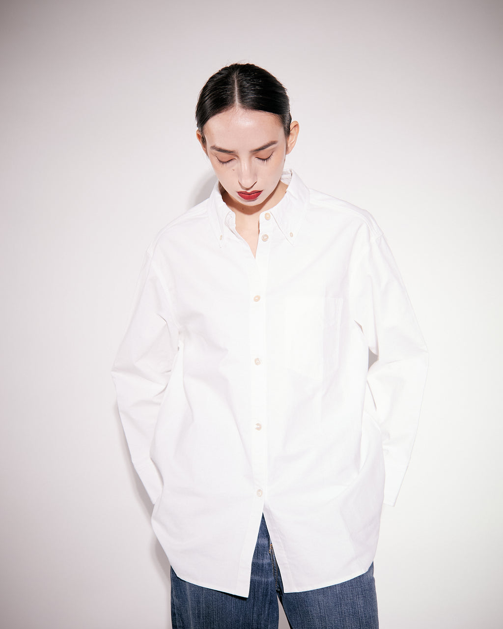 An oversized shirt crafted from a smooth poplin cotton, cut in a contemporary loose silhouette with a straight slightly wider sleeve. Featured with sewn mother of pearl buttons at front and cuff, and with an added topstitched pleat below back yoke for added detailing.