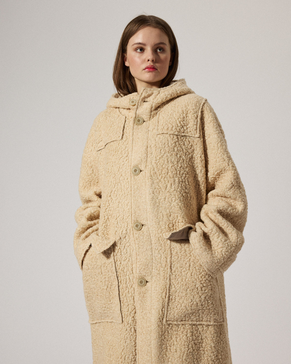 Rudie is an oversized hooded coat inspired by the classic duffle crafted in a soft, textured pile fleece in a warm oat color made from recycled fibers, offering cozy insulation and a relaxed silhouette. Featuring a concealed snap button front closure, spacious flap pockets, and a clean, tailored cut that drapes elegantly. The generous hood and the full ankle length adds functional comfort.