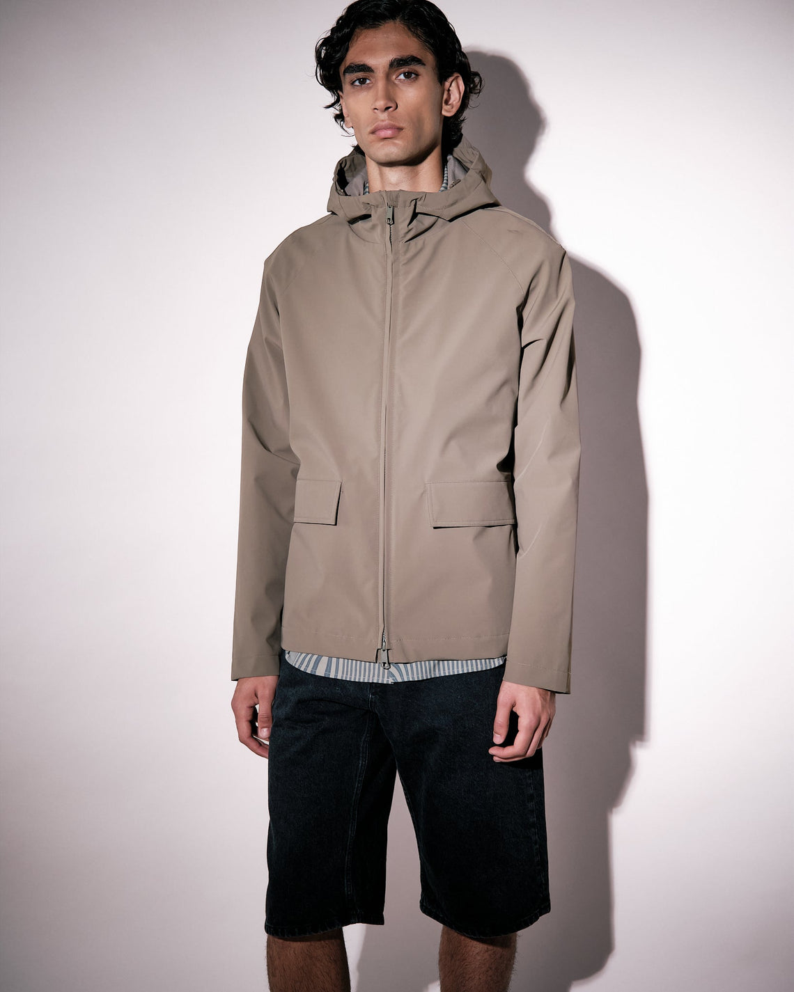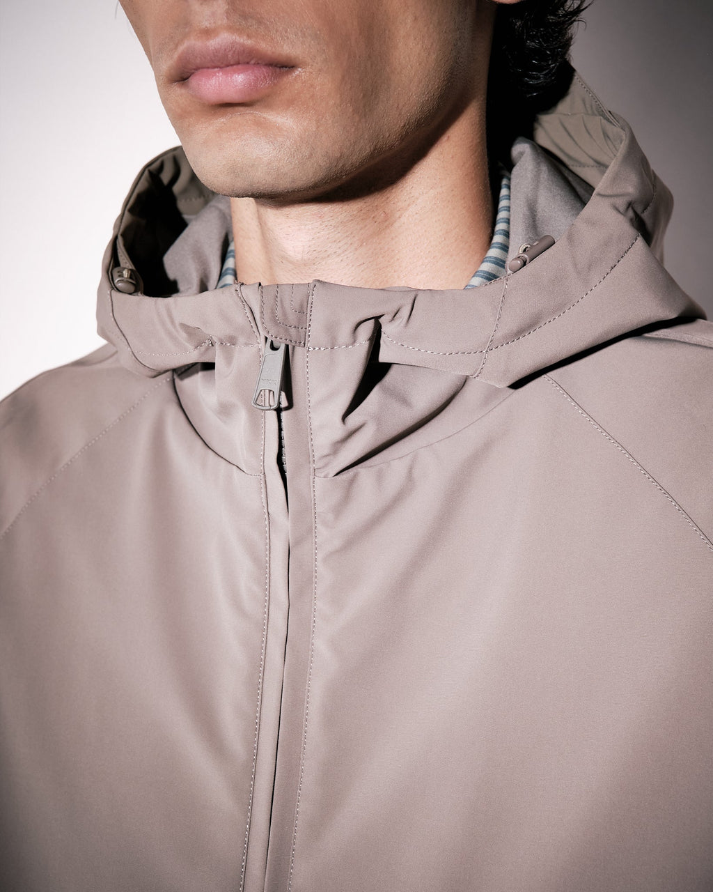 Crafted in a recycled nylon stretch quality certified by the Global Recycle Standard, this shorter jacket is both waterproof and flexible. Front zip closure with a protective placket secured by snap buttons. Featuring front flap pockets with concealed side pockets, and a hood with pull cords for added protection. The recycled nylon is derived from discarded nylon textiles or fishing nets, processed, cleaned and made into new fibres, threads and eventually woven into a brand new fabric.