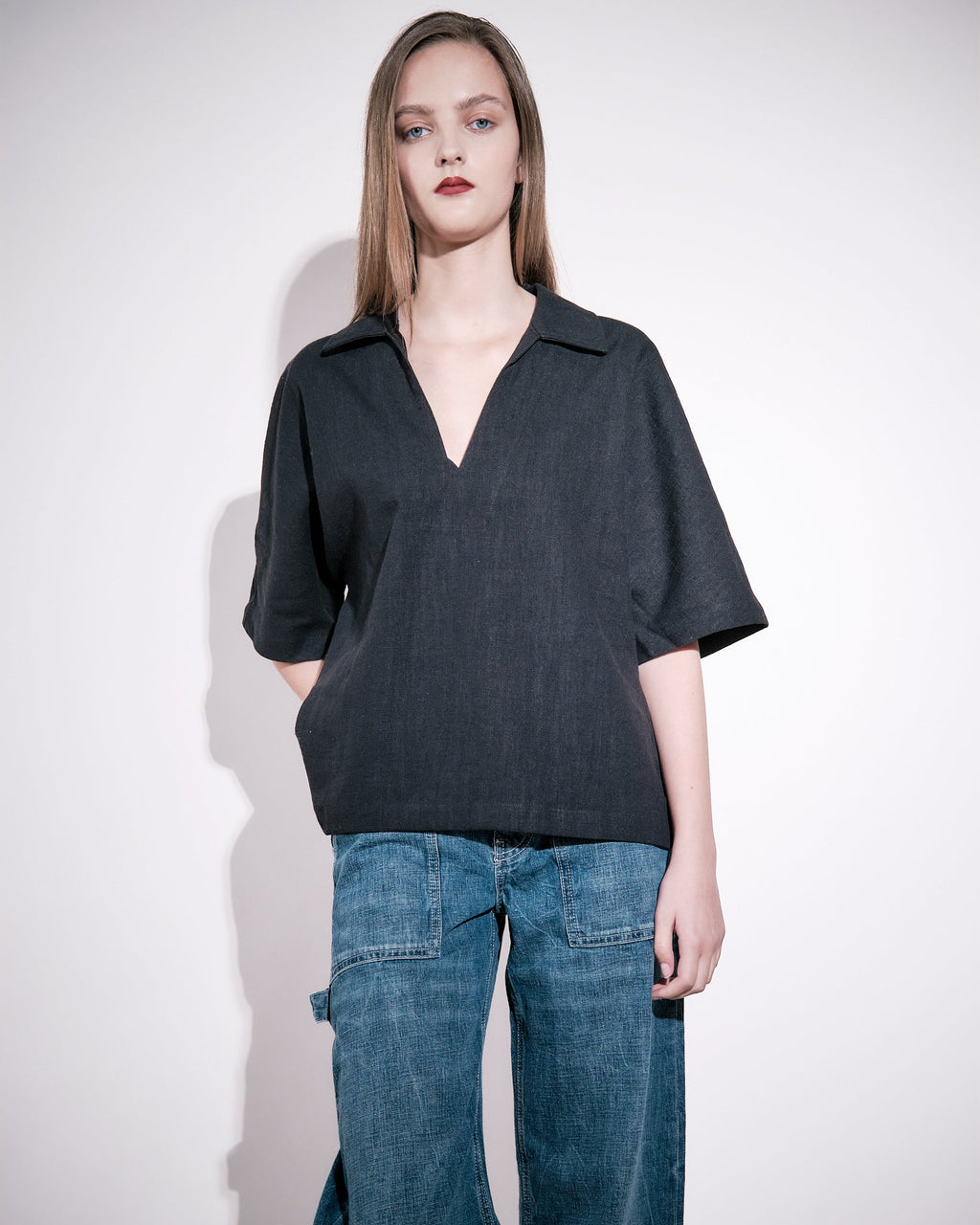 A short sleeved shirt cut in a contemporary loose silhouette crafted from a linen-cotton blend which has been washed for a soft feel to the touch. Featured with a deep v-shaped neckline and a regular collar.