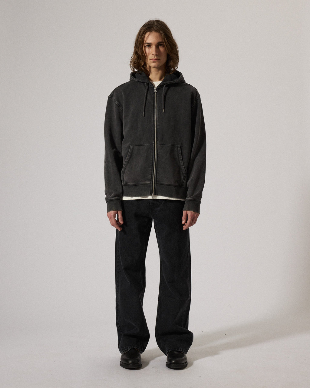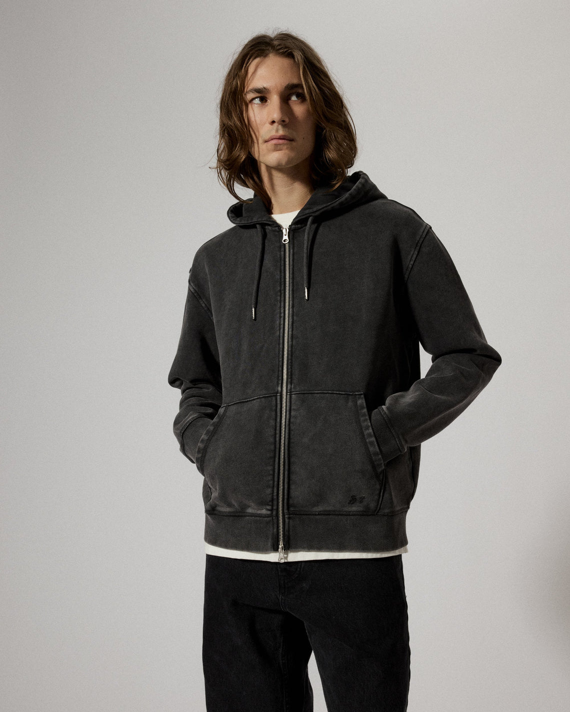 Hoodie with a two-way zip closure and pull cord at hood. Loose fit with a split kangaroo pocket, crafted in a soft sweatshirt jersey made from organic cotton and stonewashed for a vintage look. Small monogram embroidery at the left bottom hem.