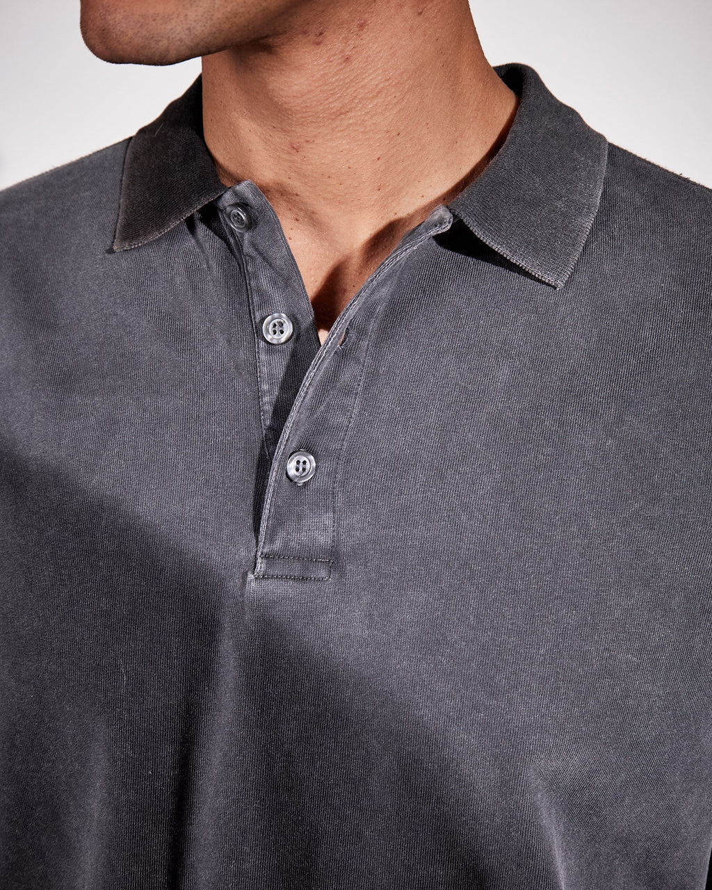 A shirt inspired by the classic rugby shirt cut in a contemporary loose silhouette with a regular collar and a three buttoned half placket. Crafted from soft midweight jersey made from organic cotton and stonewashed for a vintage look. Featured with rib knitted cuffs, decorative seams at elbows and a small monogram embroidery at the left bottom hem.
