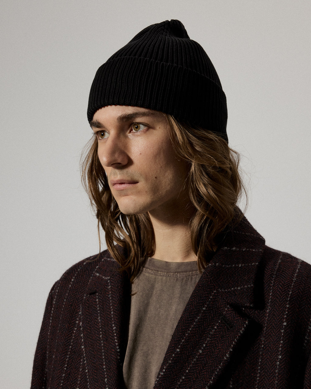 Cotton beanie knitted in a rib stitch made from 100% organic cotton treated with a stonewash for a vintage look, featured with a folded brim. One size fits most. Machine washable.