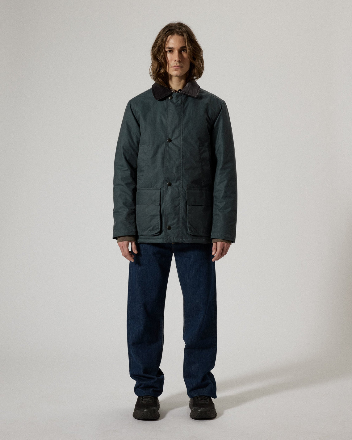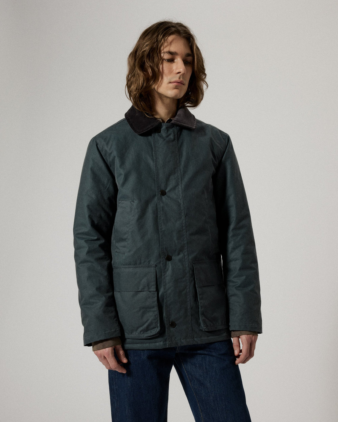 Curtis is a mid-length jacket in a regular fit made from a durable high quality organic cotton treated with a water resistant wax finish in Dundee, Scotland. Features a corduroy collar, snap button closure, two front flap pockets and two slanted welt pockets to keep your hands warm. Manufactured in the city of Birmingham, UK. For a long lasting garment, periodically rewax the shell fabric.