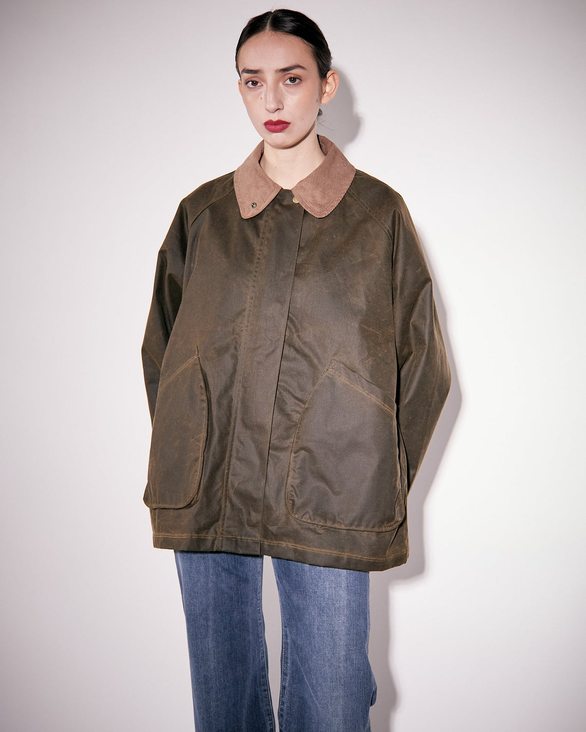 Davonna is an oversized waxed organic cotton jacket in a relaxed, A-line silhouette manufactured in the city of Birminghamn, UK. Features a regular corduroy collar, large curved front pockets, and a concealed snap-button and two way zipper front closure for a clean finish. Water-resistant and wind-repellent, with an additional snap closure in collar for added protection. For a long lasting garment, periodically rewax the shell fabric.