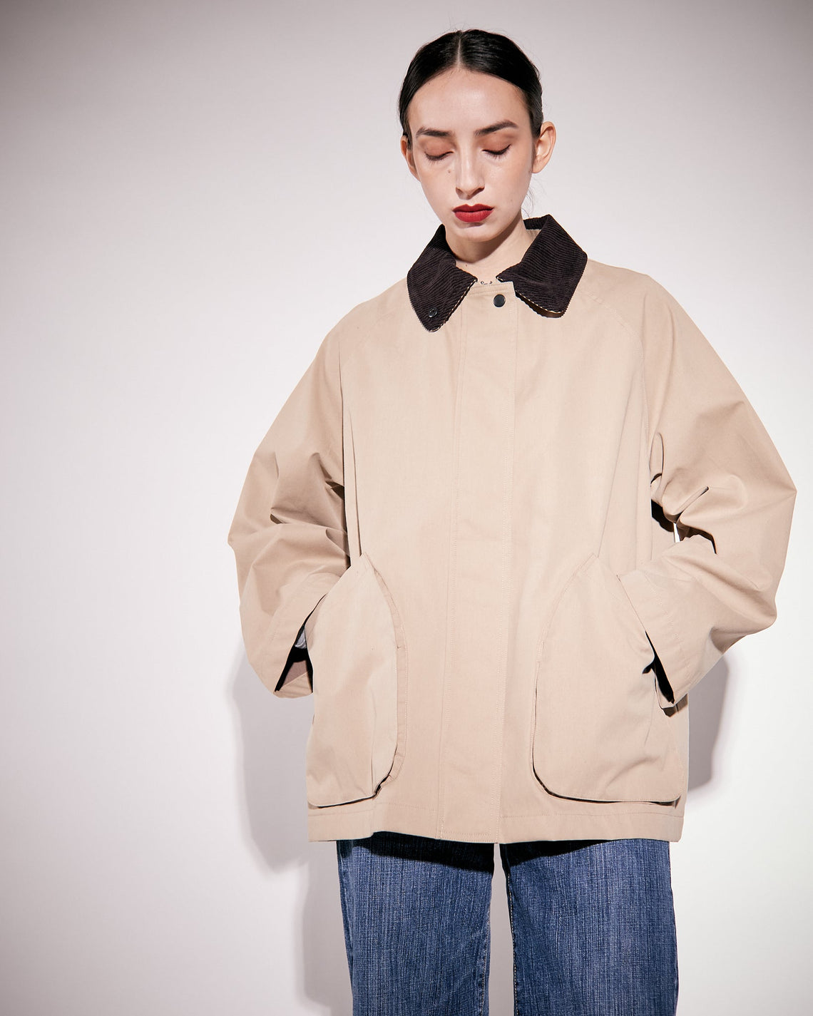 Davonna Spring is an oversized jacket crafted from an organic cotton blend in a relaxed, A-line silhouette featuring a regular corduroy collar, large curved front pockets, and a concealed snap-button and two way zipper front closure for a clean finish. Equipped with a membrane and taped seams making this jacket waterproof, and with an additional snap closure in collar for added protection.