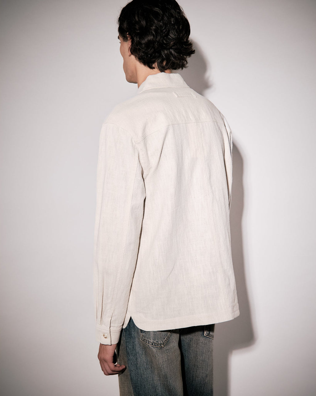 Overshirt tailored in a loose cut for a contemporary silhouette. This overshirt is crafted from a linen/cotton blend which has been washed for a soft feel to the touch. Featuring sewn buttons at front closure and cuff with slanted welt pockets at the sides.