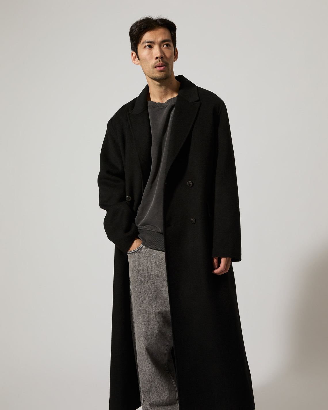 Hugo is an oversize wool coat cut to fall at the ankle, produced in Kaunas, Lithuania. The coat features a long silhouette with wider defined shoulders and detailed with double breasted buttoning at front and flap pockets at the sides. Made from a recycled wool blend, certified by the Global Recycle Standard, with a slight brushed finish soft to the touch.