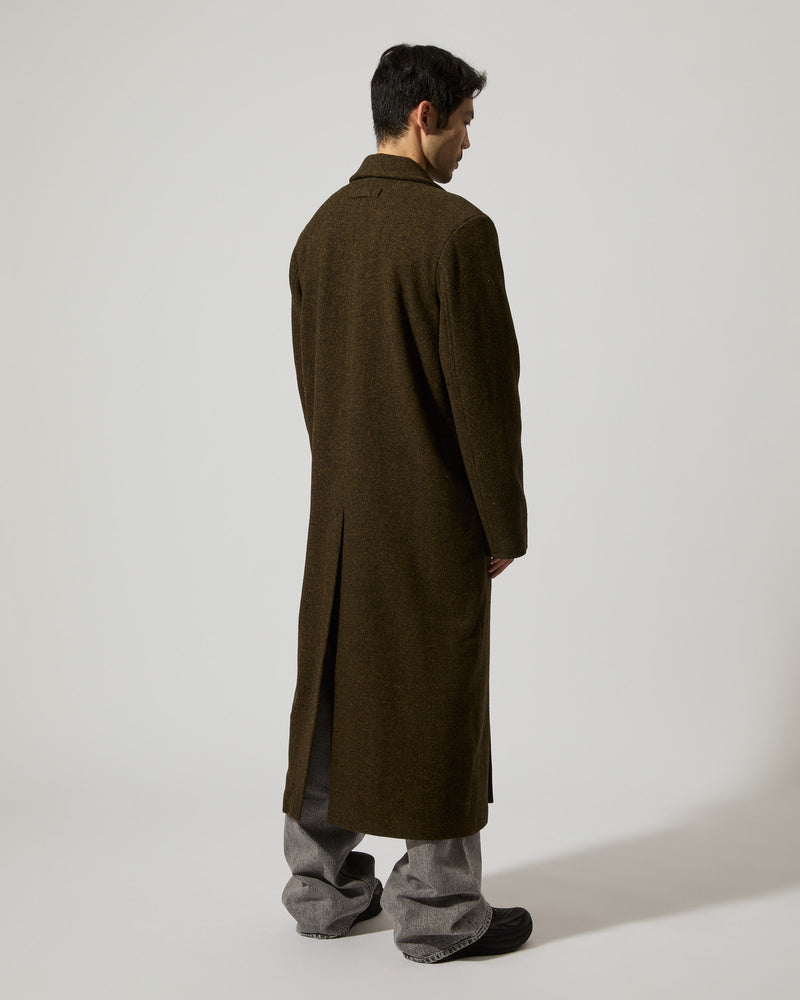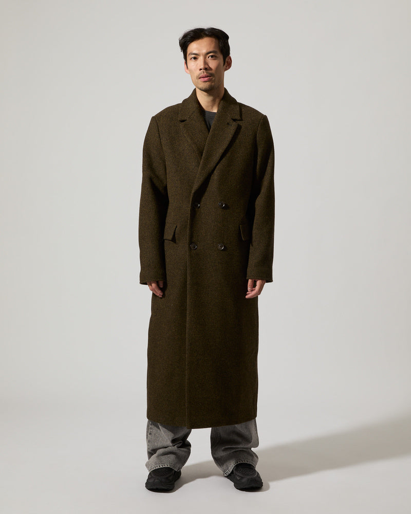 Hugo is an oversize wool coat cut to fall at the ankle, produced in Kaunas, Lithuania. The coat features a long silhouette with wider defined shoulders and detailed with double breasted buttoning at front and flap pockets at the sides. Crafted in a Shetland quality made from raw wool material which derives one hundred percent from European origin and is woven in a Portugese fabric mill, certified by Oeko-tex.