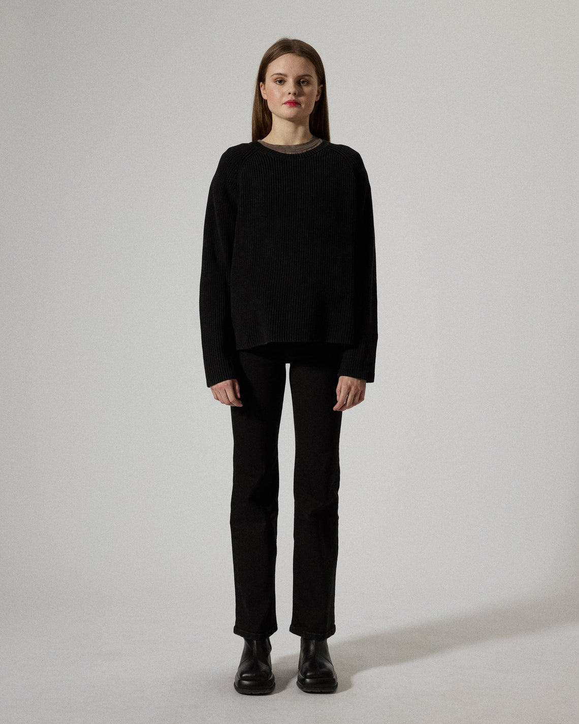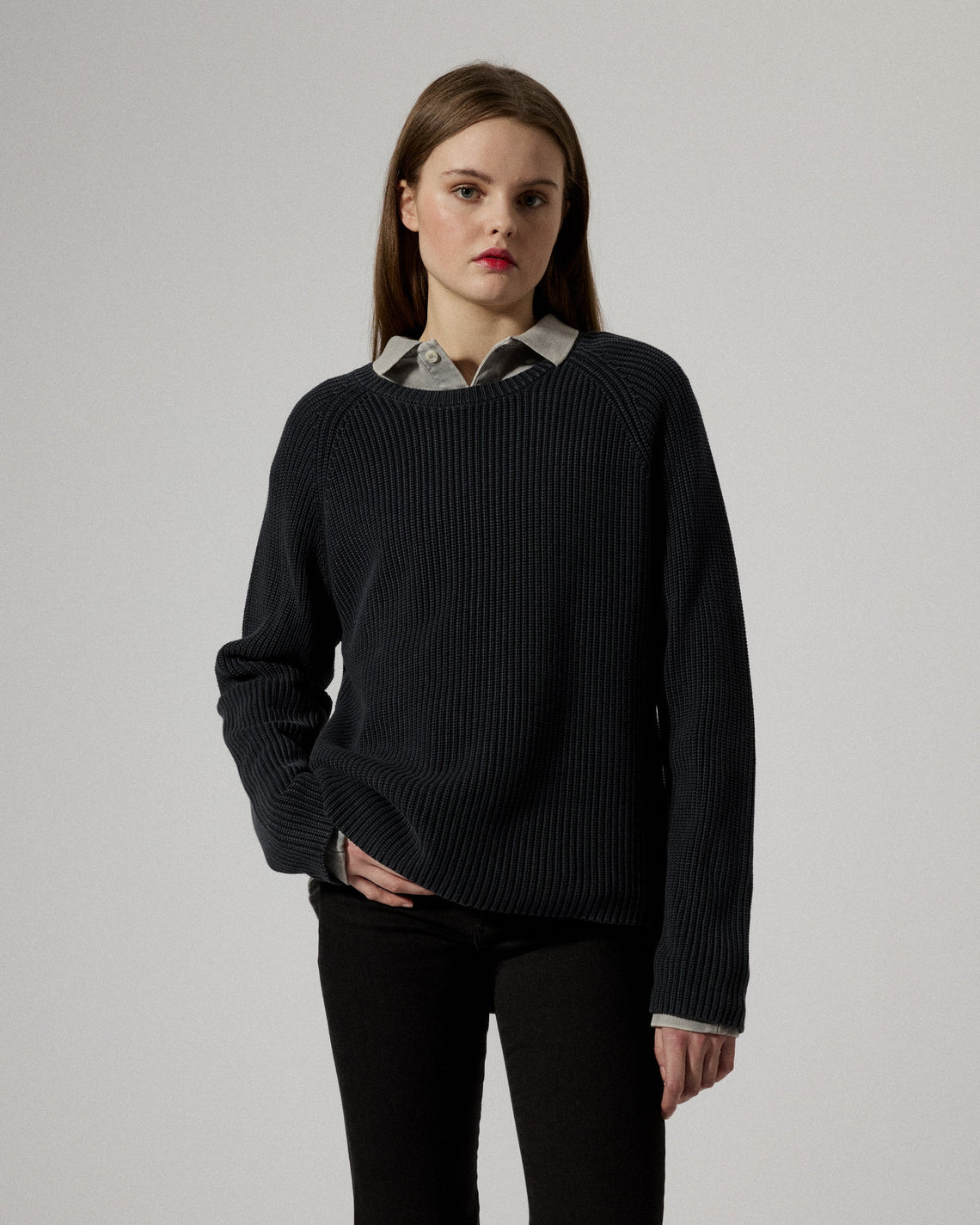 Innes is a sweater in a soft high quality organic cotton, knitted in a 5 gauge half cardigan stitch and treated with a stonewash for a vintage look. Rounded slightly wider neckline and straight endings. Small monogram embroidery at the bottom hem.