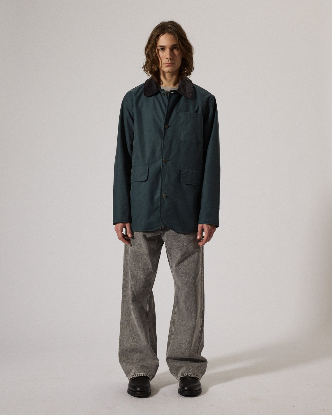 James is a mid-length jacket in a loose fit and dropped shoulders made from a durable high quality organic cotton treated with a water resistant wax finish in Dundee, Scotland. Features a regular collar in corduroy, jean button closure, two front patch pockets and a chest pocket. Manufactured in the city of Birmingham, UK. For a long lasting garment, periodically rewax the shell fabric.