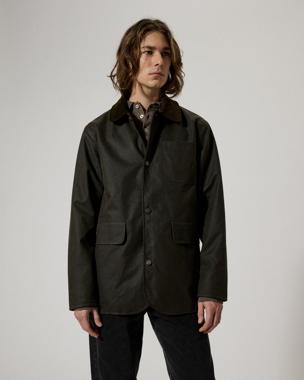James is a mid-length jacket in a loose fit and dropped shoulders made from a durable high quality organic cotton treated with a water resistant wax finish in Dundee, Scotland. Features a regular collar in corduroy, jean button closure, two front patch pockets and a chest pocket. Manufactured in the city of Birmingham, UK. For a long lasting garment, periodically rewax the shell fabric.