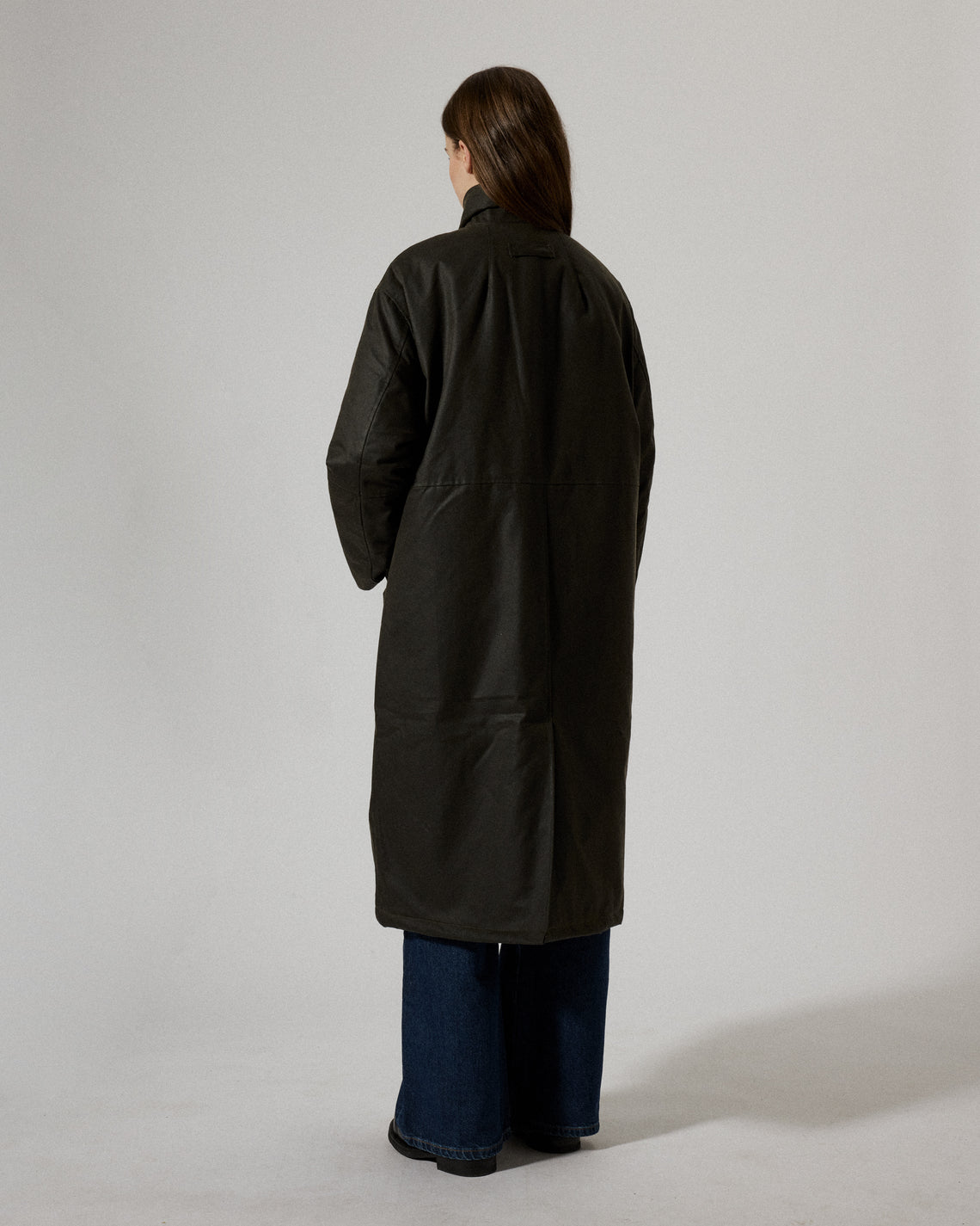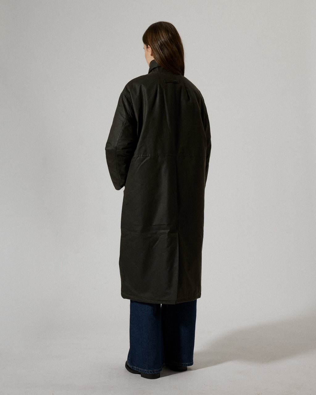 An oversized waxed organic cotton coat cut at mid-calf, manufactured in the city of Birminghamn, UK, featuring a water-resistant finish with a regular collar in corduroy. Featuring a two way zipper concealed by a placket front closure, and two front flap pockets. Designed for both practicality and timeless style, it's ideal for outdoor wear in transitional weather. For a long lasting garment, periodically rewax the shell fabric.