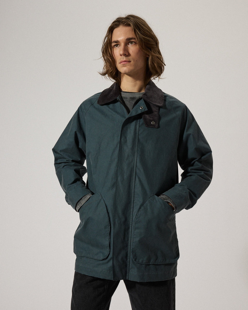 Kit is a raglan sleeve jacket in a loose fit made from a durable high quality organic cotton treated with a water resistant wax finish in Dundee, Scotland. Features a regular corduroy collar, large curved front pockets, buttoned cuff and a concealed snap-button and two way zipper front closure for a clean finish. Storm flap at front collar for added protection. For a long lasting garment, periodically rewax the shell fabric.
