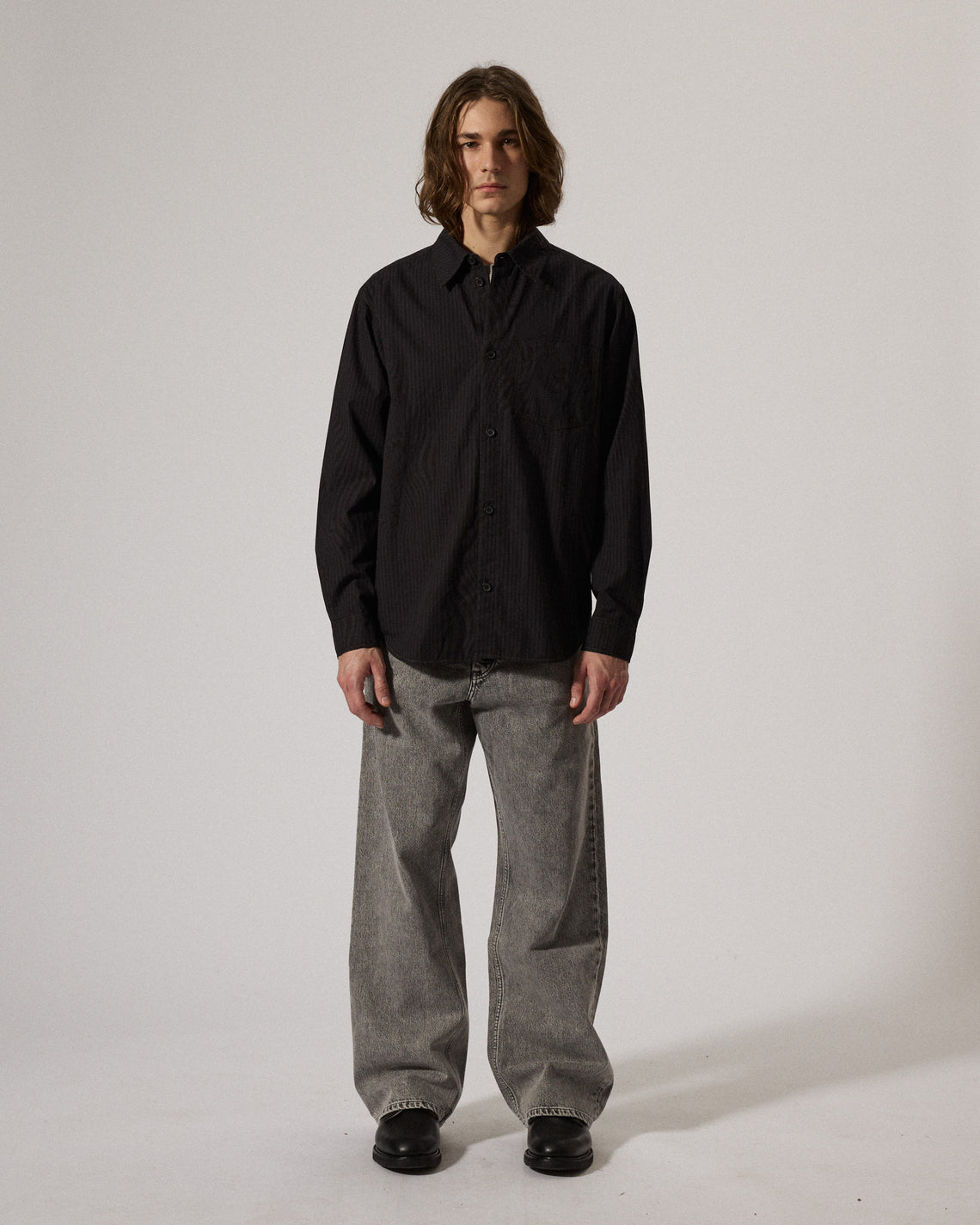 Lawrence is the classic shirt cut in a contemporary loose silhouette crafted from a crispy smooth cotton poplin. Featured with sewn mother of pearl buttons at front and cuff, and with an added box pleat below back yoke for added volume.