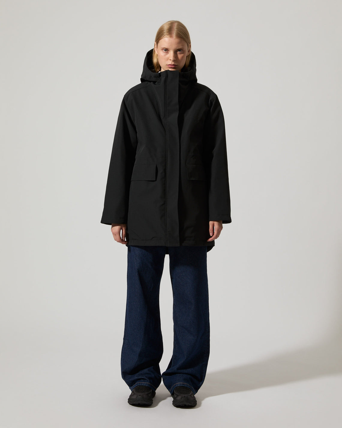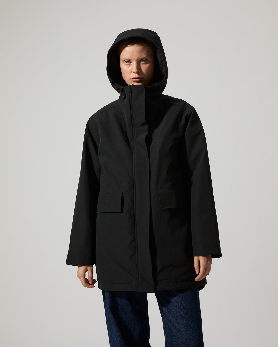 Crafted in a 4-way stretch recycled nylon quality certified by the Global Recycle Standard, this hooded and padded parka inspired style is both waterproof and insulated. Cut at a mid-length with a pull cord at waist for optional added shape. Front two way zip closure with a protective placket secured by snap buttons. Spacious front flap pockets with concealed side pockets.