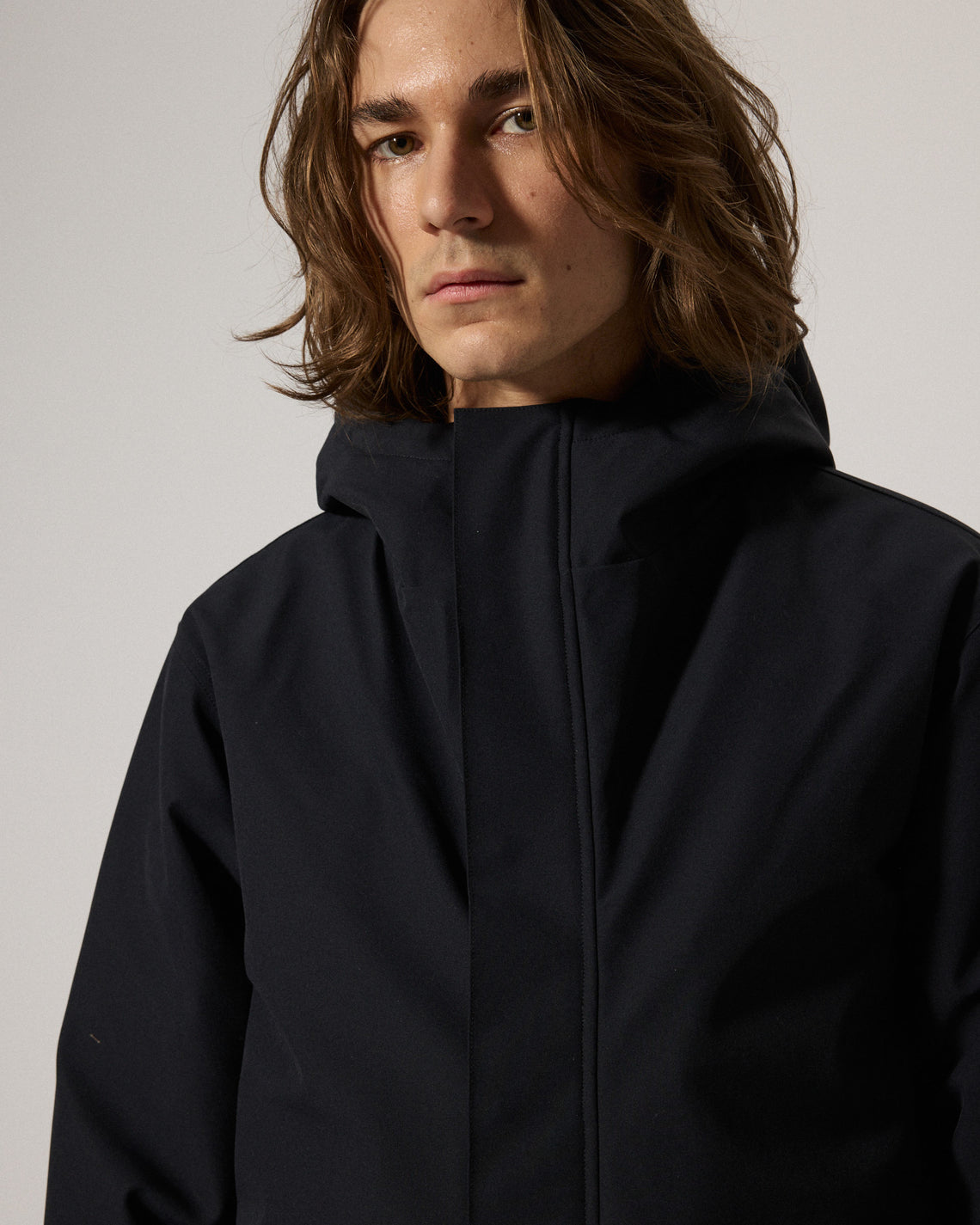 Crafted in a 4-way stretch recycled nylon quality certified by the Global Recycle Standard, Louie is a shorter jacket both waterproof and insulated. Front zip closure with a protective placket secured by snap buttons. Front flap pockets with concealed side pockets, and a padded hood with pull cords at front for added protection.