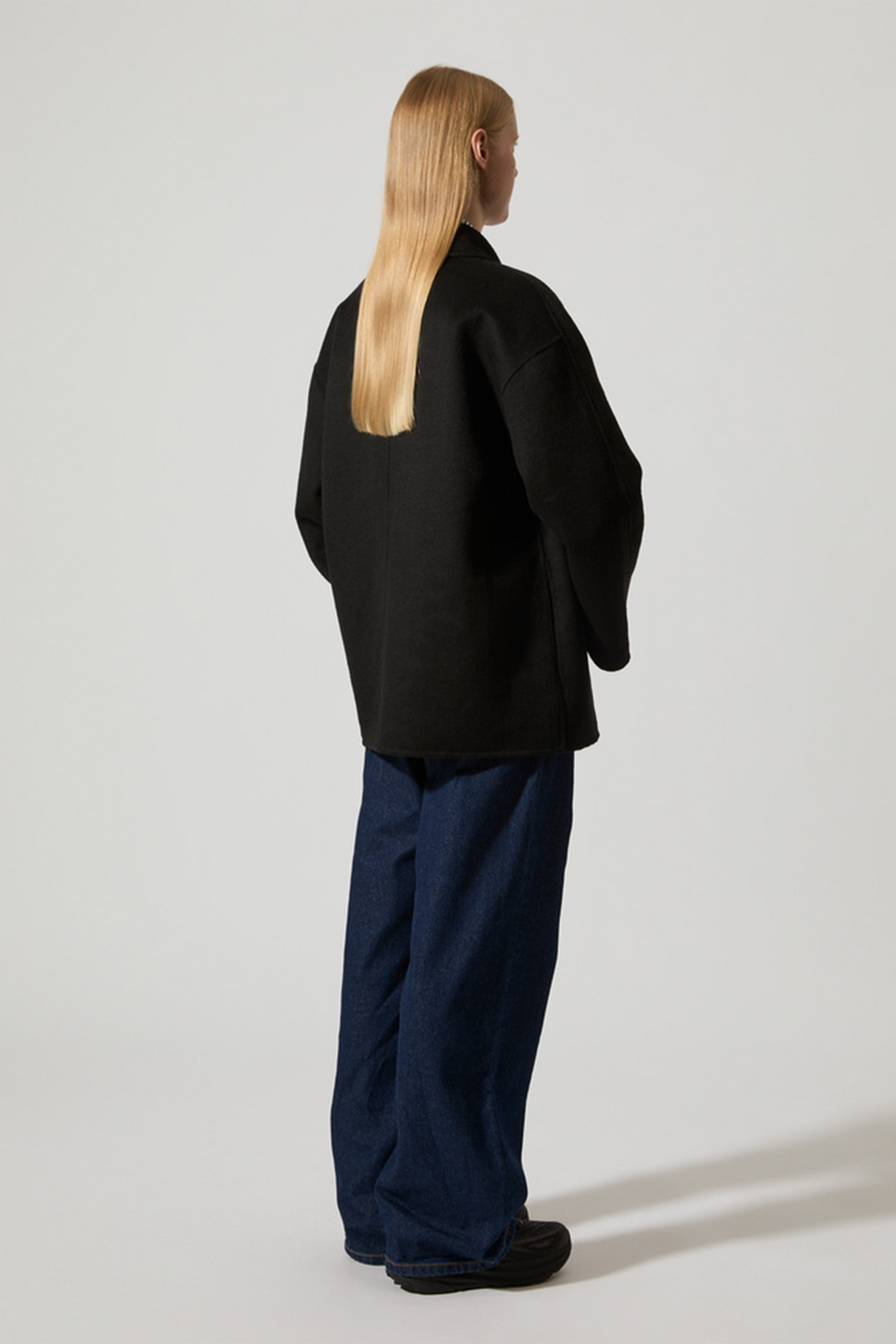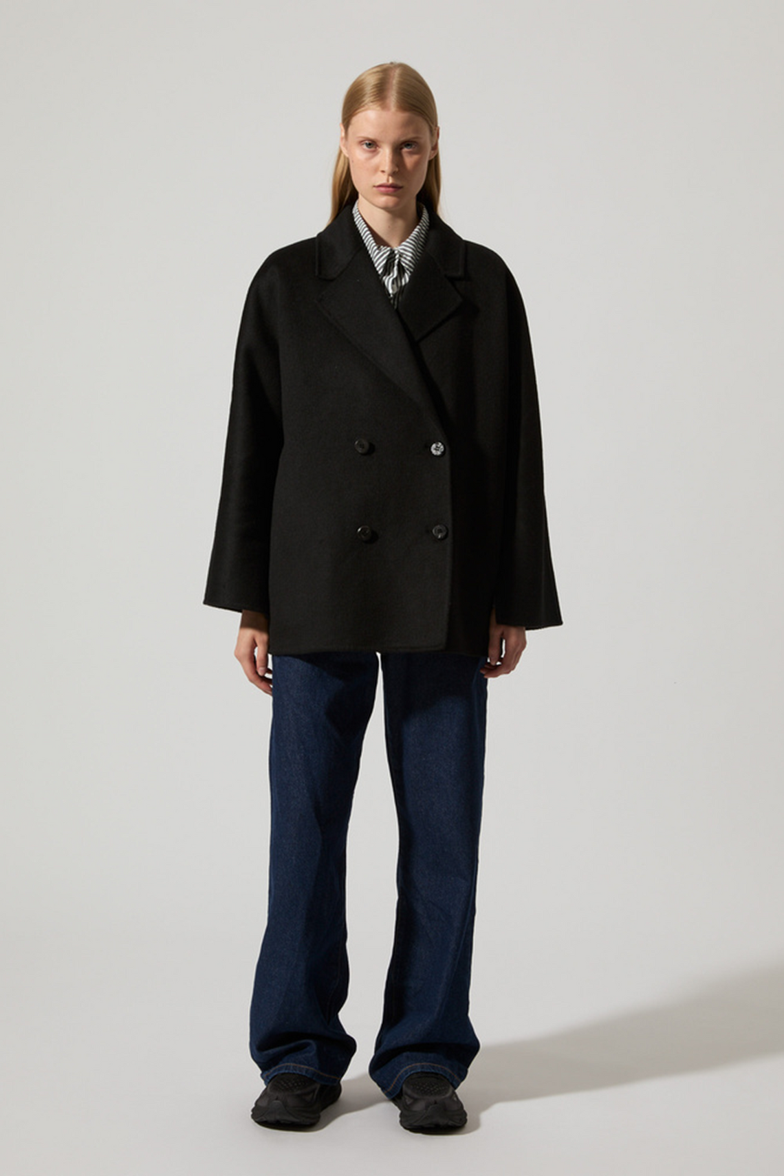 Crafted from a recycled wool blend with a slight brushed finish which creates a soft feel to the touch, certified under the Global Recycle Standard, Margot combines a traditional double breasted front closure and wider sleeves with side slits for a contemporary cut. Featuring slit pockets at the sides, and a notched collar. Unlined with french inside seams.