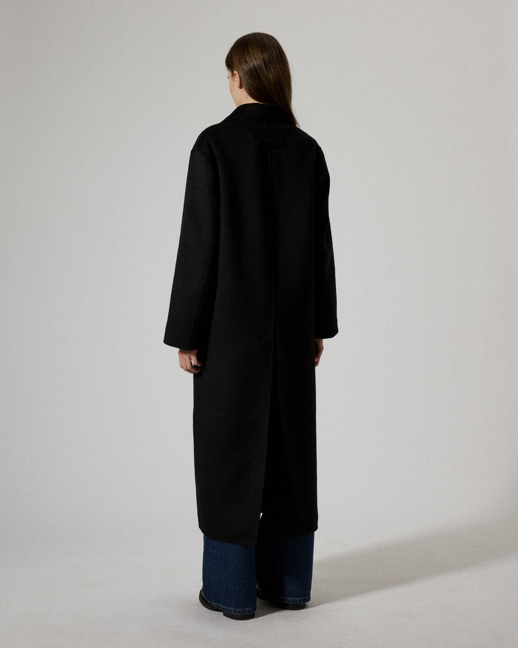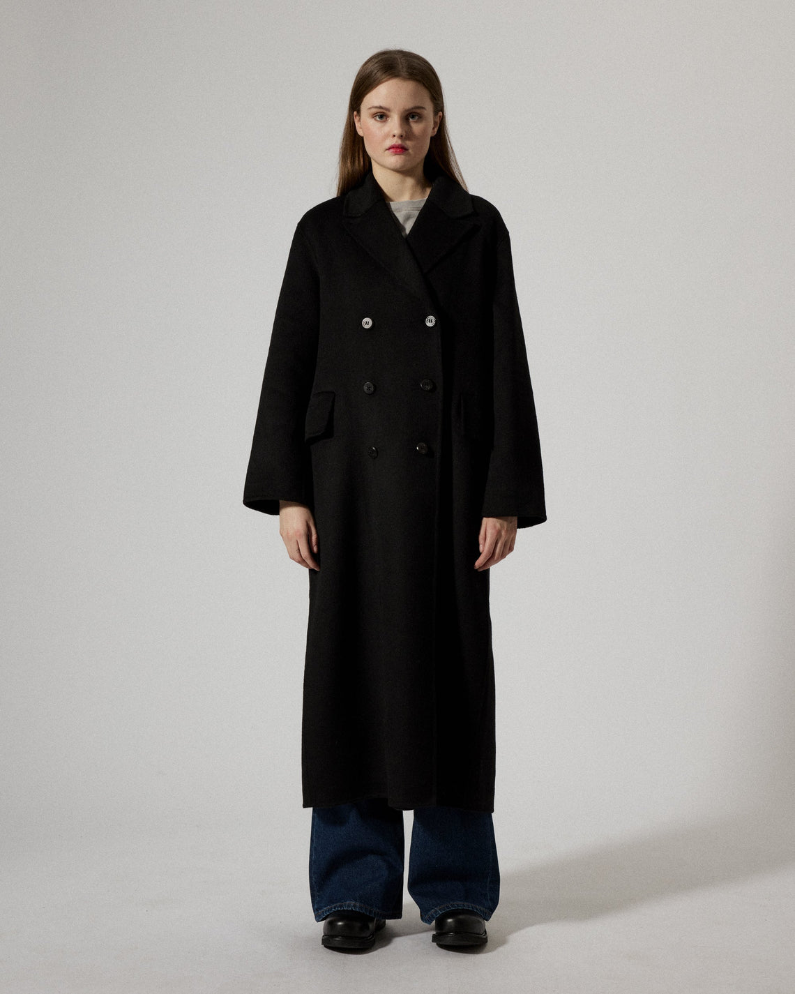 Olivia is an oversize wool coat cut to fall at the ankle. The coat features a long silhouette with wider defined shoulders and detailed with double breasted buttoning at front and flap pockets at the sides. Made from a soft recycled wool blend with a slight brushed finish which creates a soft feel to the touch, certified under the Global Recycle Standard.