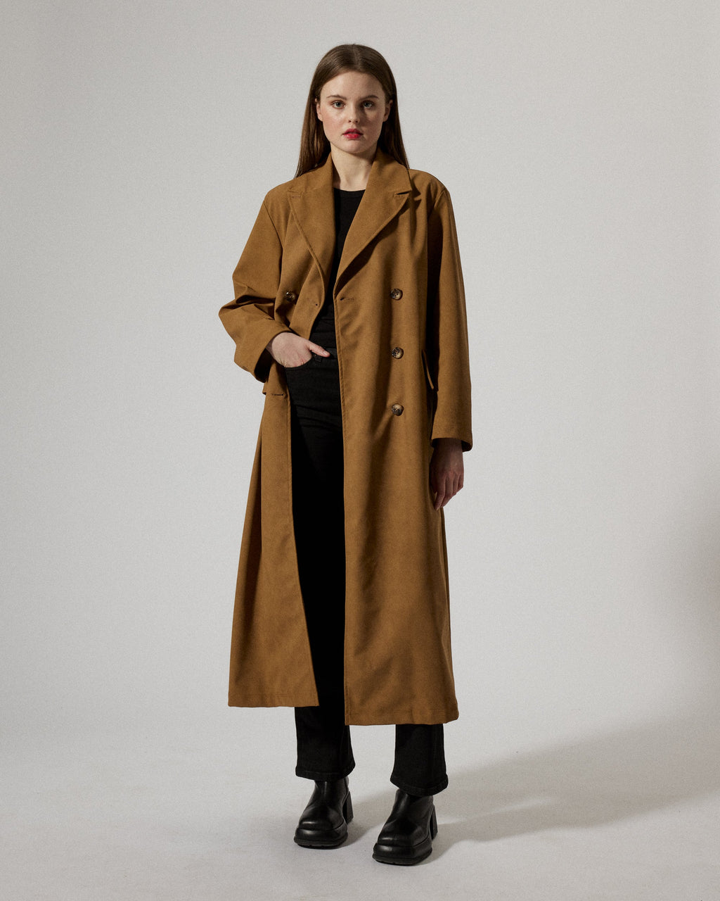 An oversize coat cut to fall at the ankle. The coat features a long silhouette with wider defined shoulders and detailed with double breasted buttoning at front and flap pockets at the sides. Crafted in a vegan fake leather suede made partially from recycled fibers with a slight brushed finish which creates a soft feel to the touch, certified under the Global Recycle Standard.