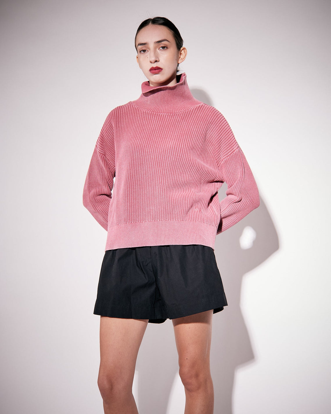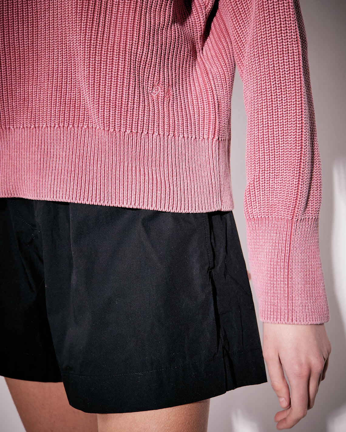 Sage is a funnel neck sweater in a soft high quality organic cotton, knitted in a 5 gauge half cardigan stitch and treated with a stonewash for a vintage look. High standing neck, bottom hem and sleeve endings in a rib knit. Discreet slits at cuff and a small monogram embroidery at the bottom hem.