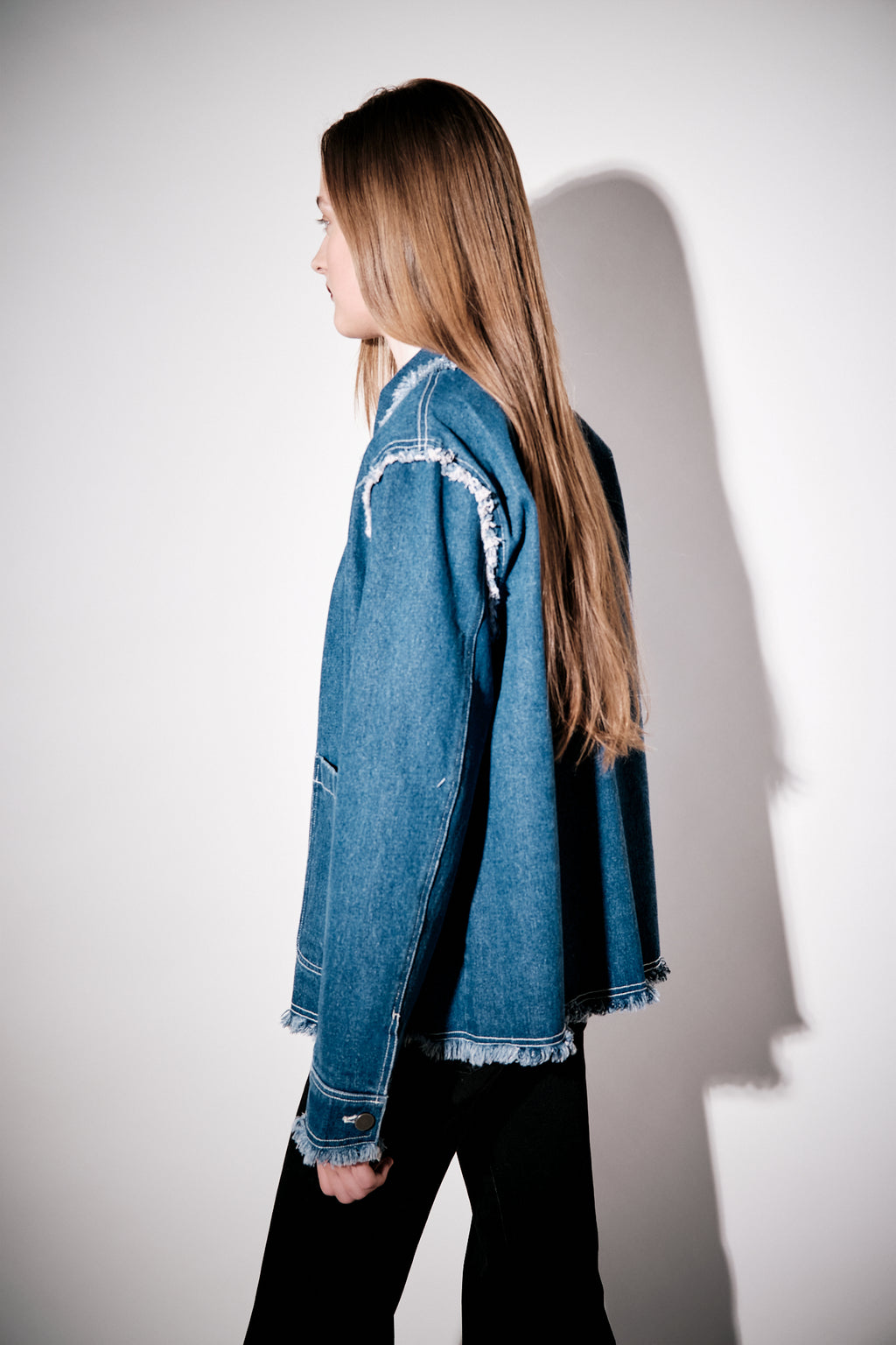 A workwear inspired jacket cut at a shorter length with visible stitching made from an organic cotton denim which has been washed for a soft feel to the touch. Seam allowance placed on the face side for a decorative fringe detailing. Featuring a regular collar and distinctive patch flap pockets and metal jean buttons at front closure and at cuff.