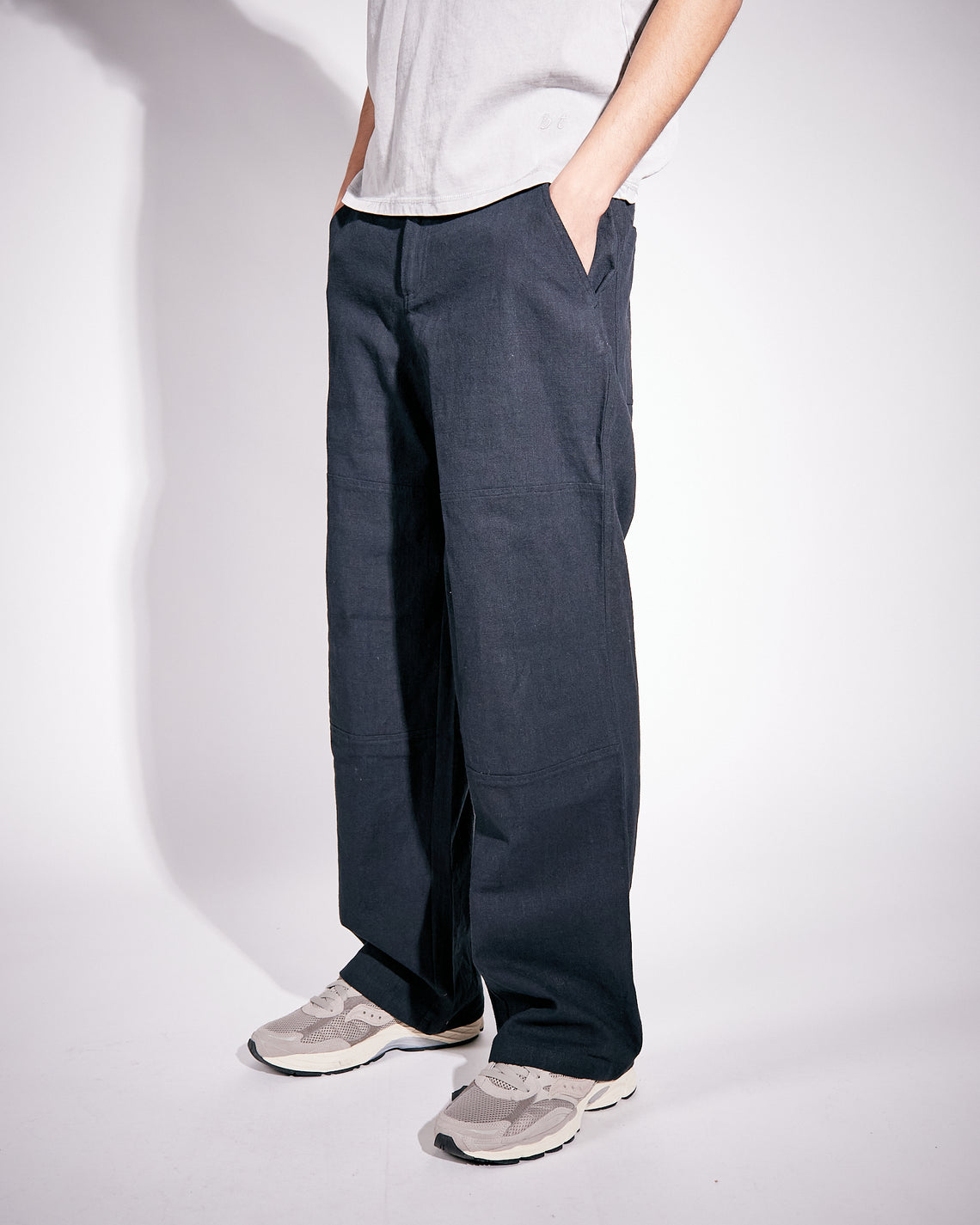Trousers in loose fit and a mid rise waist, made in a linen/cotton blend which has been washed for a soft feel to the touch. Featuring front and back pockets, and a button and zip fly at front closure. Decorative seams above and below the knee.