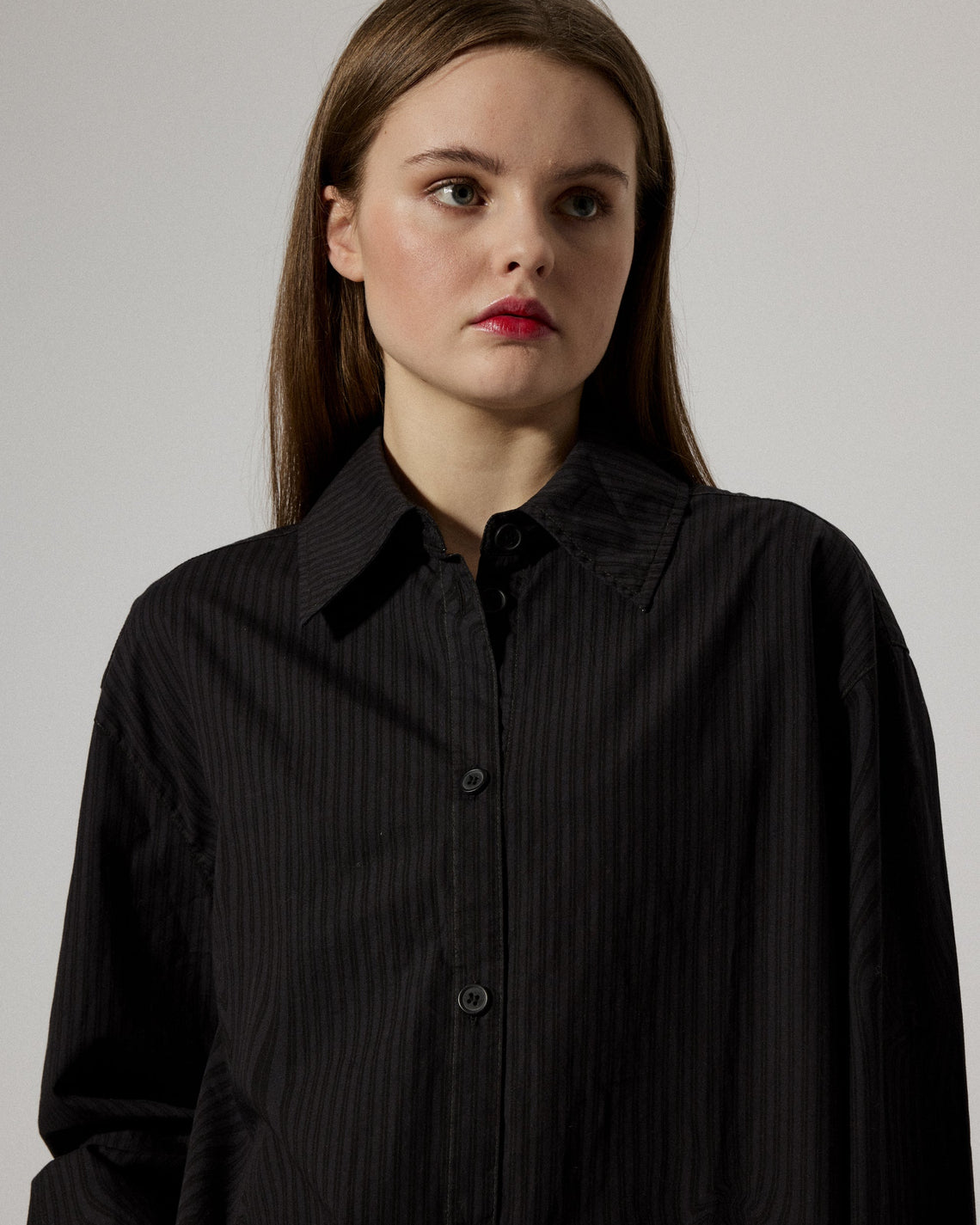 Stella is the classic shirt cut in a contemporary loose silhouette crafted from a smooth poplin cotton. Featured with sewn mother of pearl buttons at front and cuff, and with an added box pleat below back yoke for added volume. Slightly longer in the back than in the front for a flattering fit.