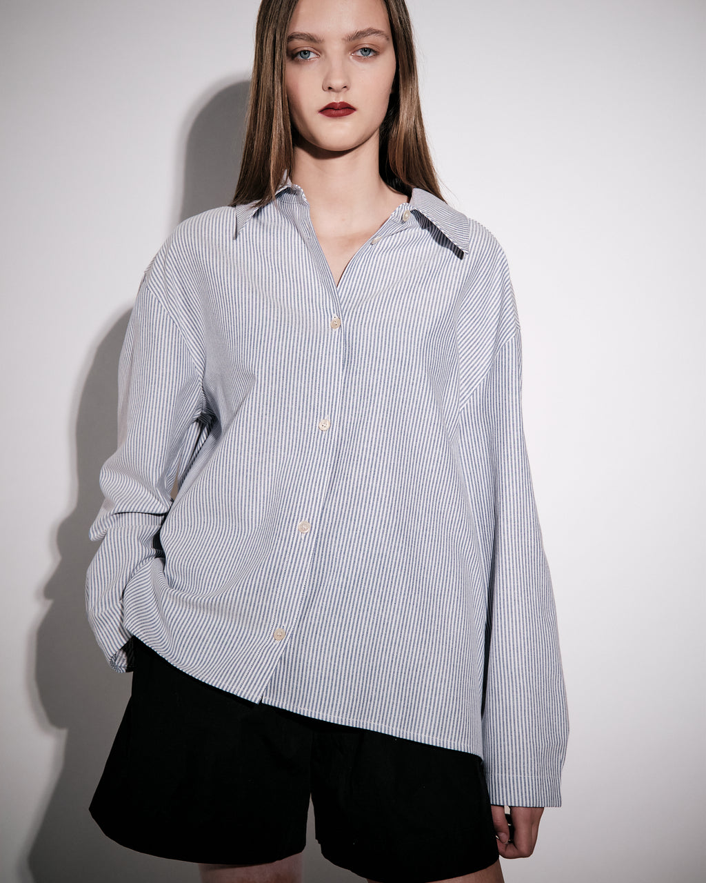 Stella is the classic shirt cut in a contemporary loose silhouette crafted from a soft Oxford cotton. Featured with sewn mother of pearl buttons at front and cuff, and with an added box pleat below back yoke for added volume. Slightly longer in the back than in the front for a flattering fit.