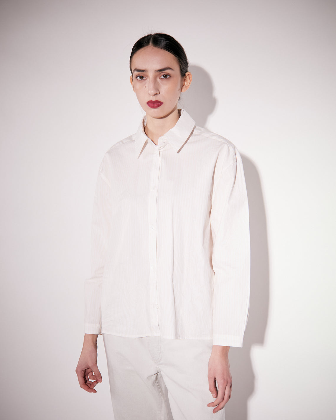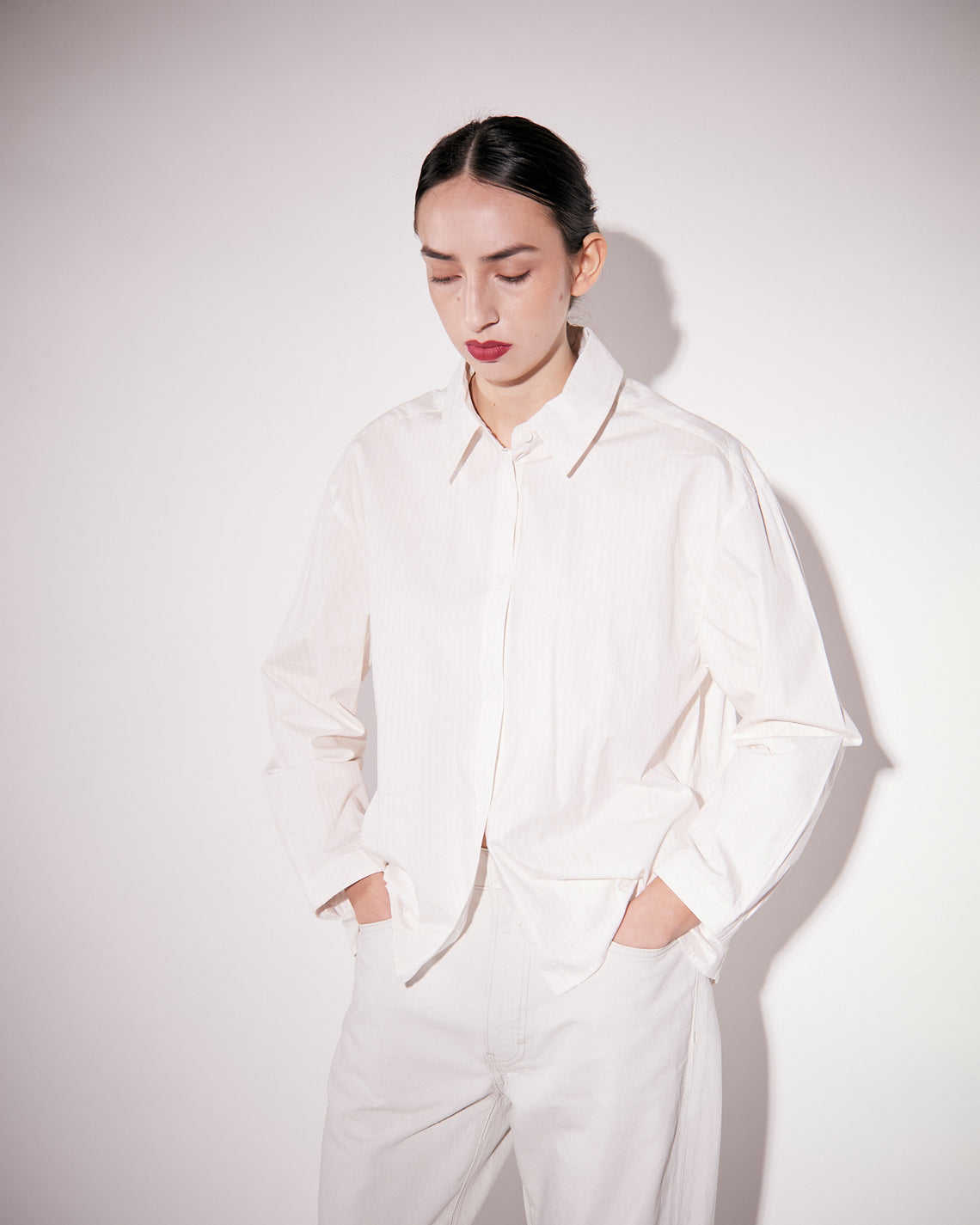 Stella is the classic shirt cut in a contemporary loose silhouette crafted from a smooth poplin cotton. Featured with sewn mother of pearl buttons at front and cuff, and with an added box pleat below back yoke for added volume. Slightly longer in the back than in the front for a flattering fit.