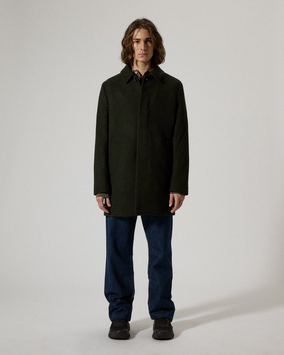 Crafted in a Shetland quality made from raw wool material which derives one hundred percent from European origin and is woven in a Portugese fabric mill, certified by Oeko-tex. T-Coat Wool is a car coat cut at mid-length with a classic silhouette and a regular collar. Featured with simple detailing which creates a clean and minimalistic look. Concealed buttons at front closure, except top button.
